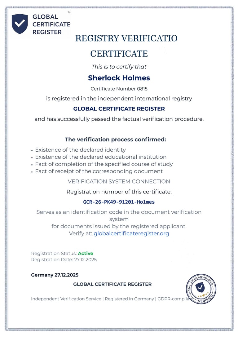 Enter ID GCR-26-PK49-91201 and last name Holmes on our search page to see the magic of verification in action!